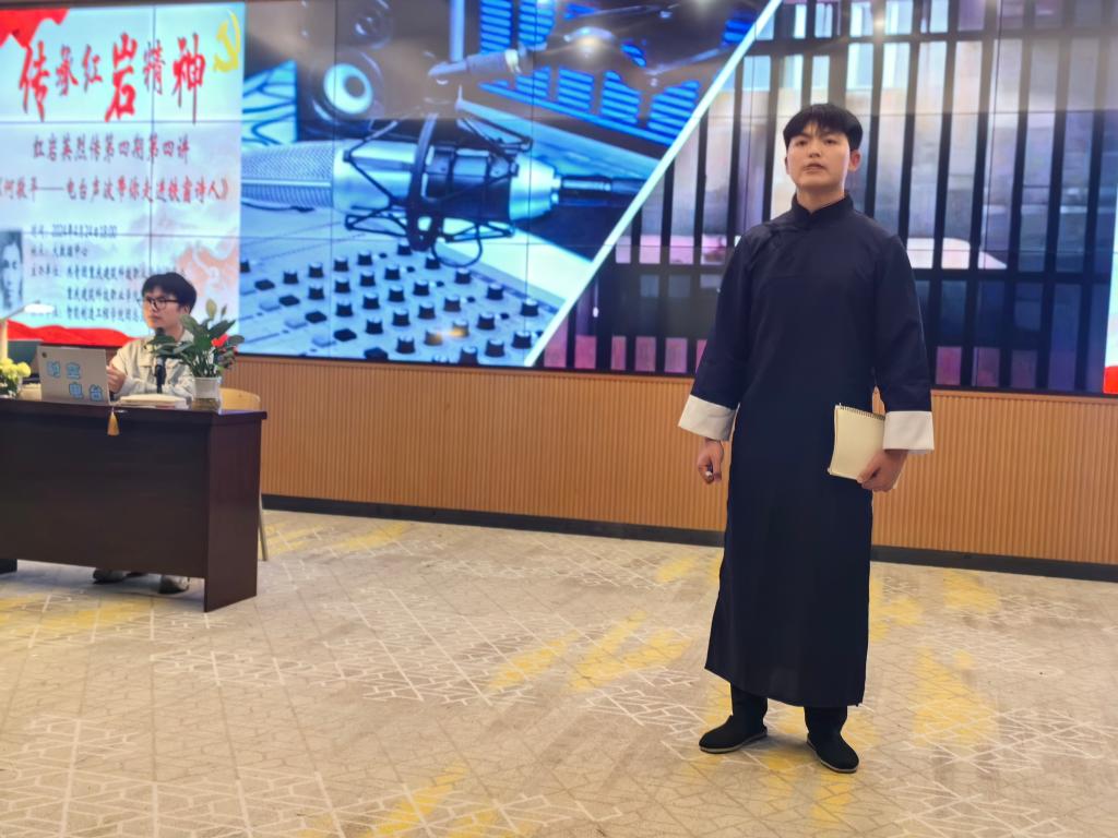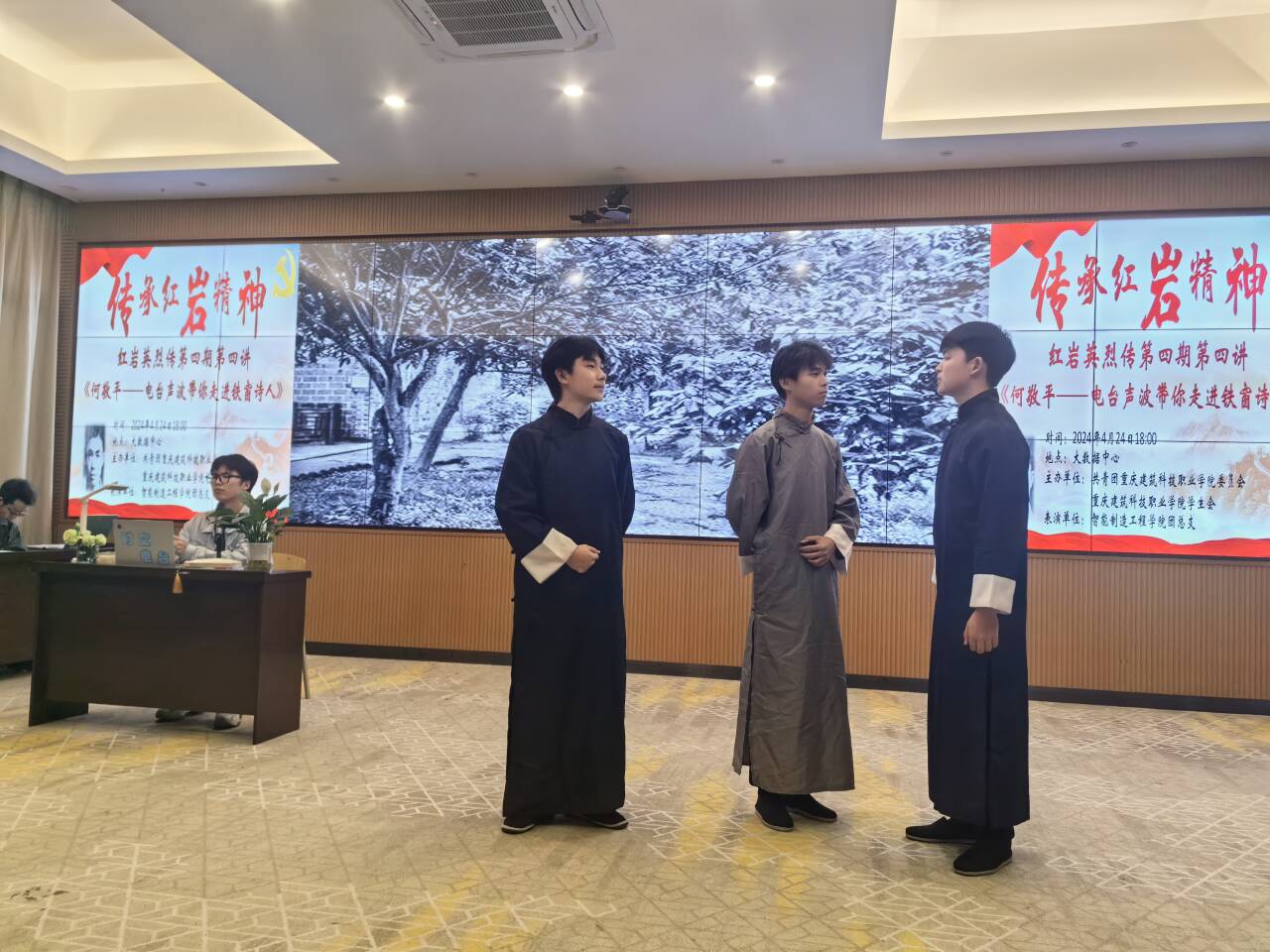 2024年4月24日下午18:00整,我院在大数据中心开展“红岩英烈传”话剧表演系列——《何敬平电台声波带你走进铁窗诗人》。此次话剧表演是为进一步加强革命传统教育,缅怀革命先烈的丰功伟绩,寄托对革命先烈的哀思,培养学生的爱国主义精神和高尚情操