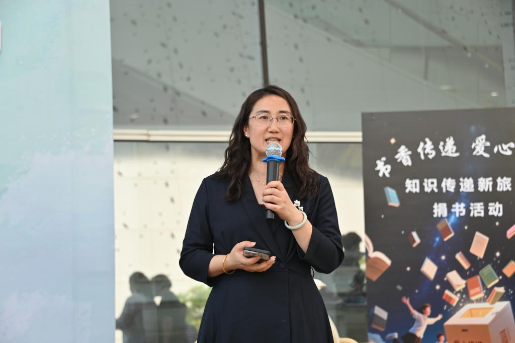 活动现场王靖副校长致辞,她讲到每一本书都承载着知识与智慧的重量,更凝聚着捐赠者的无私情怀。希望此次活动能搭建起资源共享的桥梁,让更多师生在阅读中受益,让书香浸润校园的每个角落。她倡导全校师生积极参与读书节活动,共同营造“爱读书、读好书、善读书”的校园氛围。