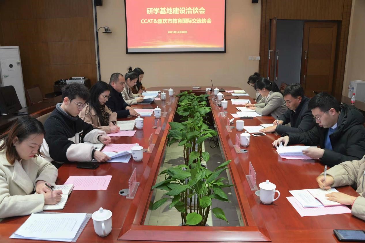 重庆市教育国际交流协会服务中心副主任杨郭强介绍了研学基地建设申报资料的要求、推广方案与预期效果。牟章志副主任强调做好研学基地建设工作,理念上应站在人文交流高度,课程上要凸显人文内容,管理上要富有人文特色,文化上彰显人文底蕴,活动中推进人文教育,师生要提升人文素养。双方就人文科技素养提升研学基地建设、项目申报、教育国际化等议题进行了深入洽谈与交流。