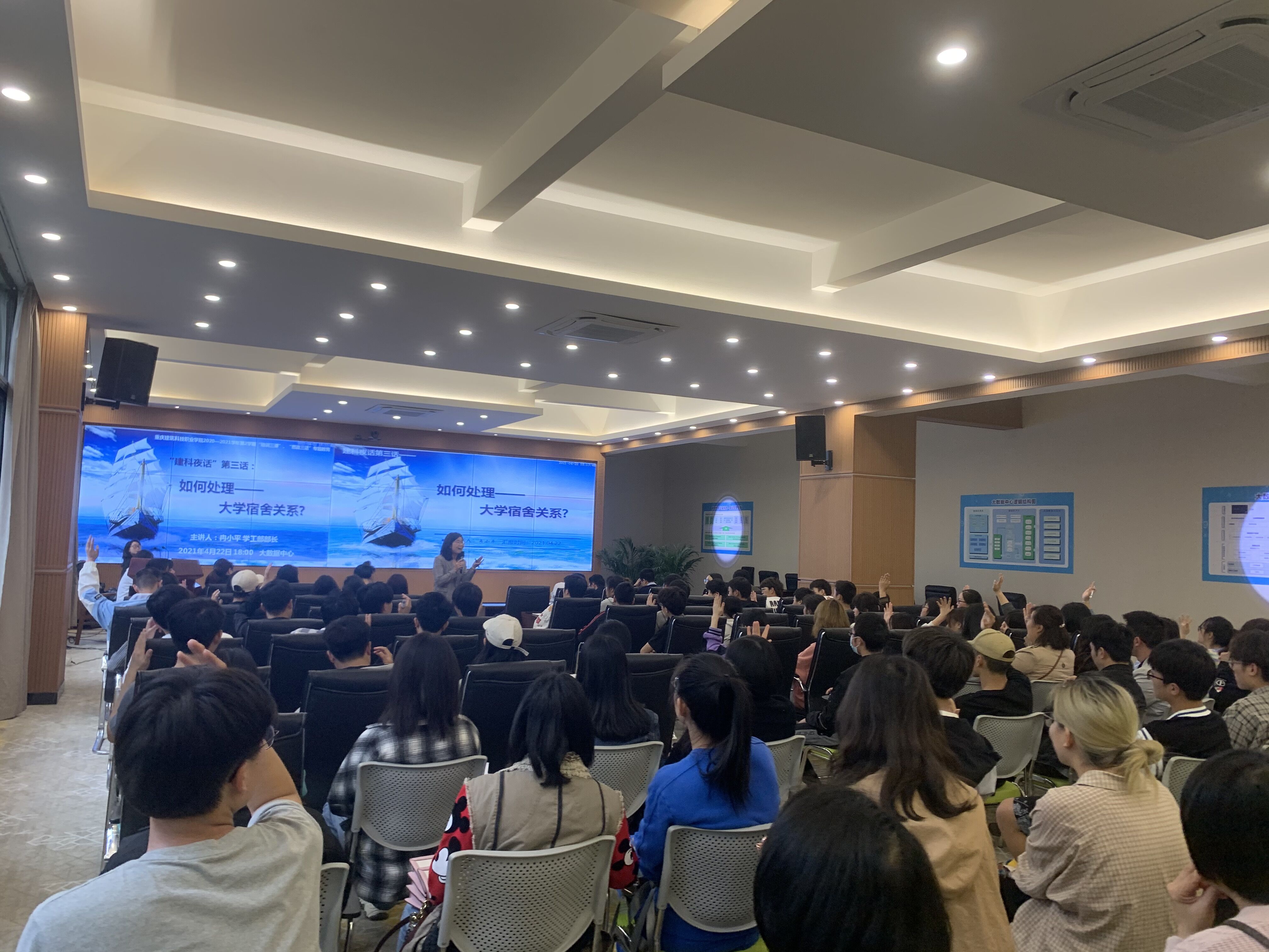 活动开始,冉小平部长为大家讲述了几例因宿舍关系处理不当而发生恶性事件的案例,随即同学们纷纷讲述自己所期待的寝室关系。紧接着冉处长用数据化信息展示宿舍关系现状并分析宿舍矛盾原因,结合同学们的反馈进入到“建言献策”环节。同学们积极发言,活动氛围如火如荼。最后冉处长为大家支招,希望同学们坚持三大“宝典”:思想上尊重各自的生活习惯,行为上互帮互助,态度上不为小事计较。坚持“四个关键词”为行为准则——尊重、理解、包容、改变。