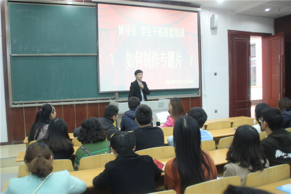 为了推动“精彩主题班会”活动的广泛开展,提高辅导员工作技能水平,提升学生干部综合素质,11月19日中午,学工部组织全体辅导员、部分学生班长和学生党员服务站全体成员,在2205教室开展了专题片制作技能培训。党委宣传部湛杨老师为大家作了精彩辅导。