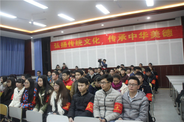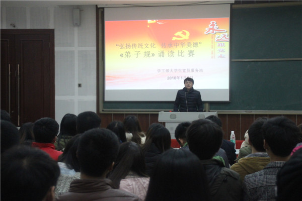 为了弘扬传统文化,传承中华美德,加强学生党员和入党积极分子的德育教育,2016年1月6日,学工部在3205教室,组织党员服务站102名学生党员、入党积极分子分成5支小队,开展了《弟子规》诵读比赛。学院督导室谭银锋老师、学工部大学生成长教育教研室赖泽凤老师、重庆市高校辅导员技能大赛第三名辅导员刘小进老师到会并作了精彩点评。
