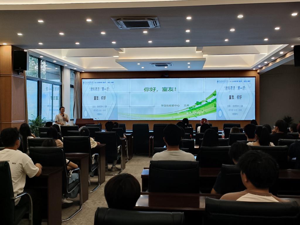 202391918:00,学校学工部在2023-2024学年第一学期组织的建科夜话第一话专题讲座在大数据中心举行宿舍管理中心王燕老师室友,你好为题进行讲座,值班书记、专职辅导员以及在校学生代表共80人参与。