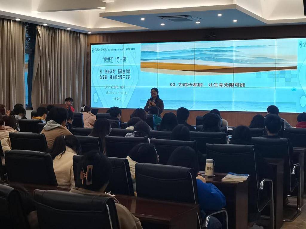 202431218:00,学校学工部在2024学年第一学期组织的思想汇”第一课专题讲座在大数据中心举行,学工部冉小平部长“热辣滚烫”看改变你能改变的,接纳你改变不了为题进行讲座,值班书记、专职辅导员以及在校学生代表共90余人参与。