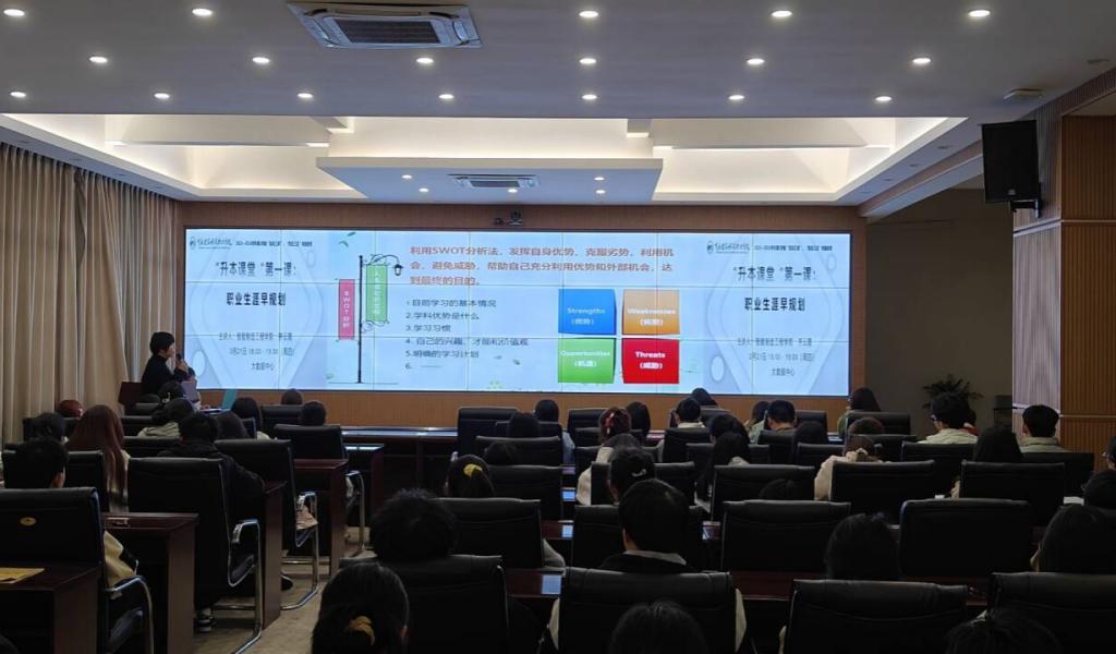 202432118:00,学校学工部在2024学年第一学期组织的“升本学堂”第一课专题讲座在大数据中心举行,智能制造工程学院的齐云霞书记职业生涯早规划为题进行讲座,值班书记、专职辅导员以及在校学生代表共90余人参与。