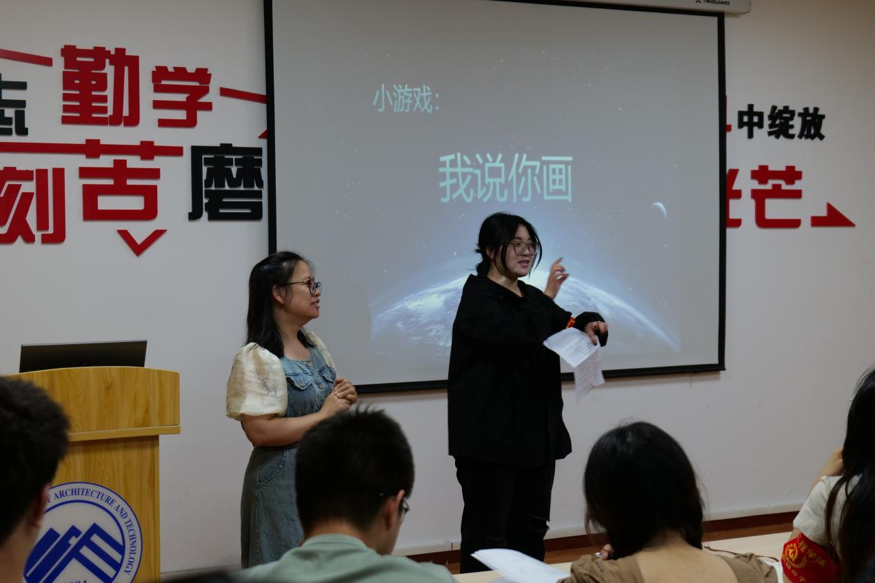 讲座刚开始,周老师通过给大家讲了一个关于秀才买柴的故事“我说你画”小游戏告诉大家团队沟通是人与人之间、人与群体之间思想与感情的传递和反馈的过程,有效的沟通能够促进团队成员之间的理解和合作,提高工作效率,解决问题,实现共同目标。