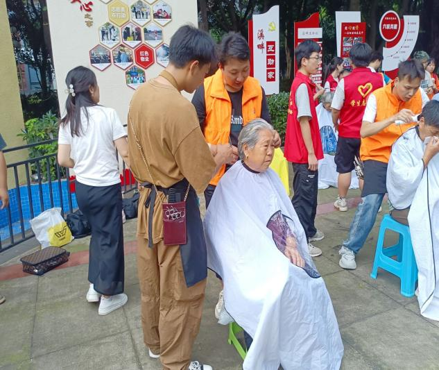 参加活动的同学们在社区书记的带领下,通过协助理发、为老人测血压、测血糖、宣传垃圾分类等方式帮助和关心独居老人。