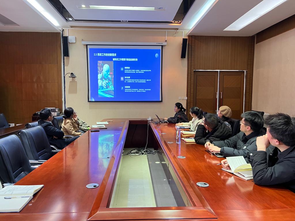 在人工智能(AI)浪潮席卷全球的今天,它不仅成为技术革命的先锋,更是教育领域内一股不可忽视的变革力量。作为高校思政教育的中坚力量,辅导员们如何在这一时代背景下,有效利用AI工具提升工作效率、创新教育方式,成为了一个值得深入探讨的课题2025年2月27日下午15时,辅导员“跃迁+”发展共读研讨推进会第十三期——“DeepSeek如何赋能新时代思政工作”在立德楼五楼会议室举行。本次研讨会由数字工程学院董媛老师主持,学校副校长李果、学工部部长冉小平、学生处副处长周玟瑾、数字工程学院书记张运来及数字工程学院全体辅导员数共同参与。