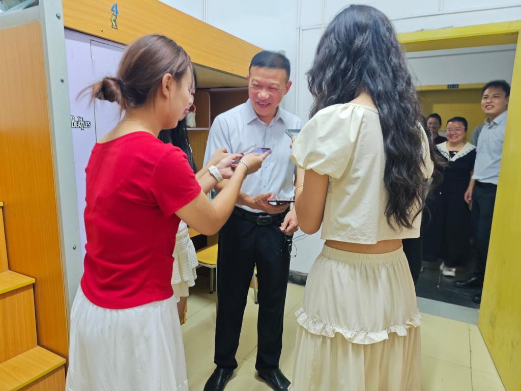 “同学们从哪里来?”“报到过程还顺利吗?”“食堂的饭菜还合口味吗?”“生活上还有什么困难?”每走进一间宿舍,张校、李校都与新生们进行亲切交谈,细致地询问同学们的生源地、入学感受、专业选择以及对校园环境的适应情况,耐心倾听同学们初入大学的所思所感,并现场解答同学们关于学业规划、校园生活等方面的疑问。A、C、E栋宿舍和高层公寓楼,张校与来自五湖四海的同学们围在一起,亲切话家常。他勉励同学们要尽快完成角色转变,适应大学的学习和生活节奏,珍惜宝贵的大学时光,做好学业规划,打牢专业基础,同时也要注重全面发展,积极参与校园文化活动和社会实践,提升综合素养。他特别叮嘱同学们要互相关心、互相帮助,建立深厚的同窗情谊,共同营造团结友爱、积极向上的宿舍氛围,并与同学们互加微信好友