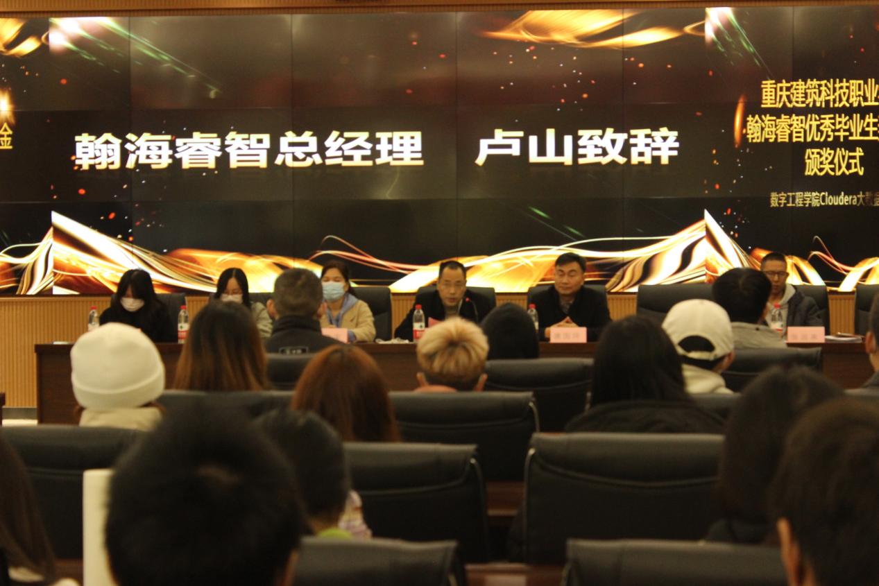 2021年11月9日中午12:40,数字工程学院(Cloudera大数据学院)第一届“翰海睿智优秀毕业生奖学金”颁奖仪式在大数据中心顺利举行。数字工程学院唐国坪院长、张运来书记、重庆翰海睿智大数据科技股份有限公司总经理卢山、教研总监伍飞宇、校区经理刘秀云、辅导员蒋玉婷老师、汪田老师,以及20级、21级学生代表参加了本次颁奖仪式。此次仪式由20级大数据技术与应用专业王骏媛同学主持。