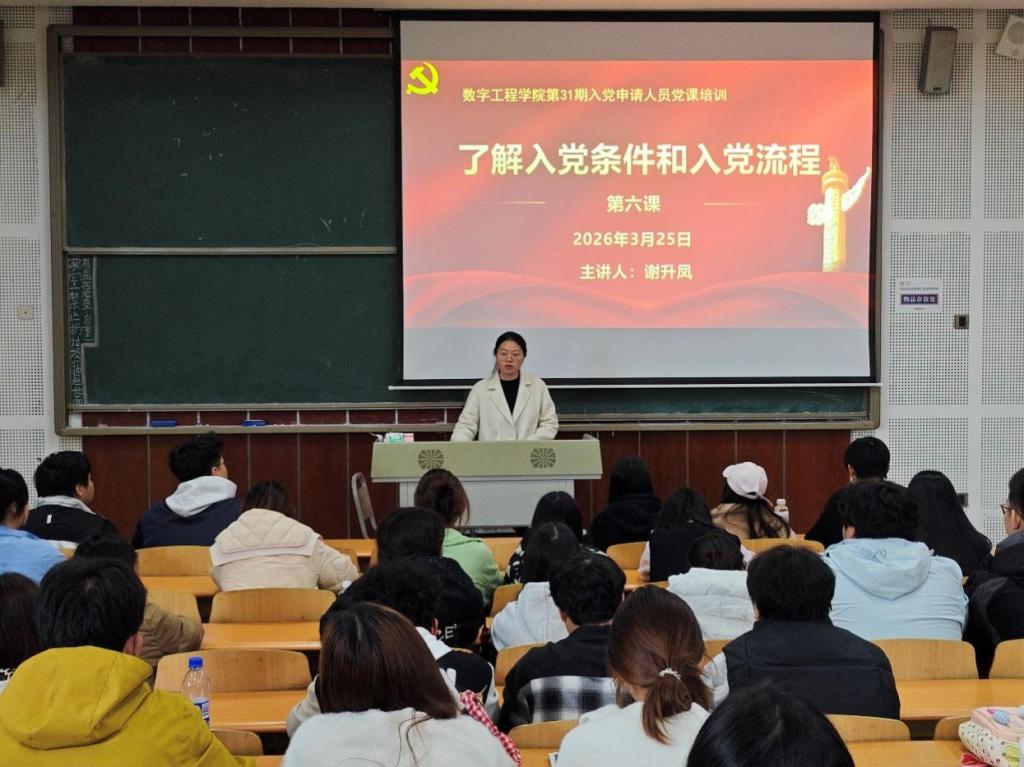 为进一步规范党员发展工作,帮助入党申请人全面掌握入党基本条件、准确理解入党流程的严肃性,引导其端正入党动机、明确努力方向,2026年3月25日,数字工程学院第31期入党申请人党课培训第六讲在笃学楼2305顺利举行。本次培训由谢升凤同志主讲,第31期入党申请人参加学习。