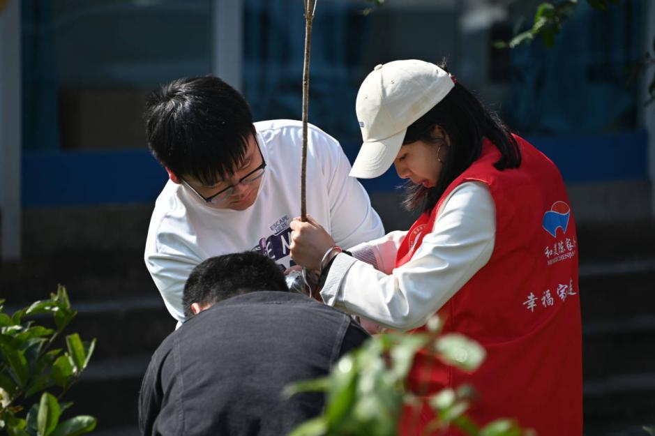 植树现场,大家分工协作,配合默契。身穿红马甲的志愿者代表们格外耀眼,他们挖坑、放苗、培土、整平、浇水,用自己的双手为家乡播种下绿意。大家三人一组、五人一簇,挥动铁锨,劳动场面热火朝天。或扶正树苗、挥锹铲土;或填平树坑、踩实新土;或提水浇树、培土围堰。