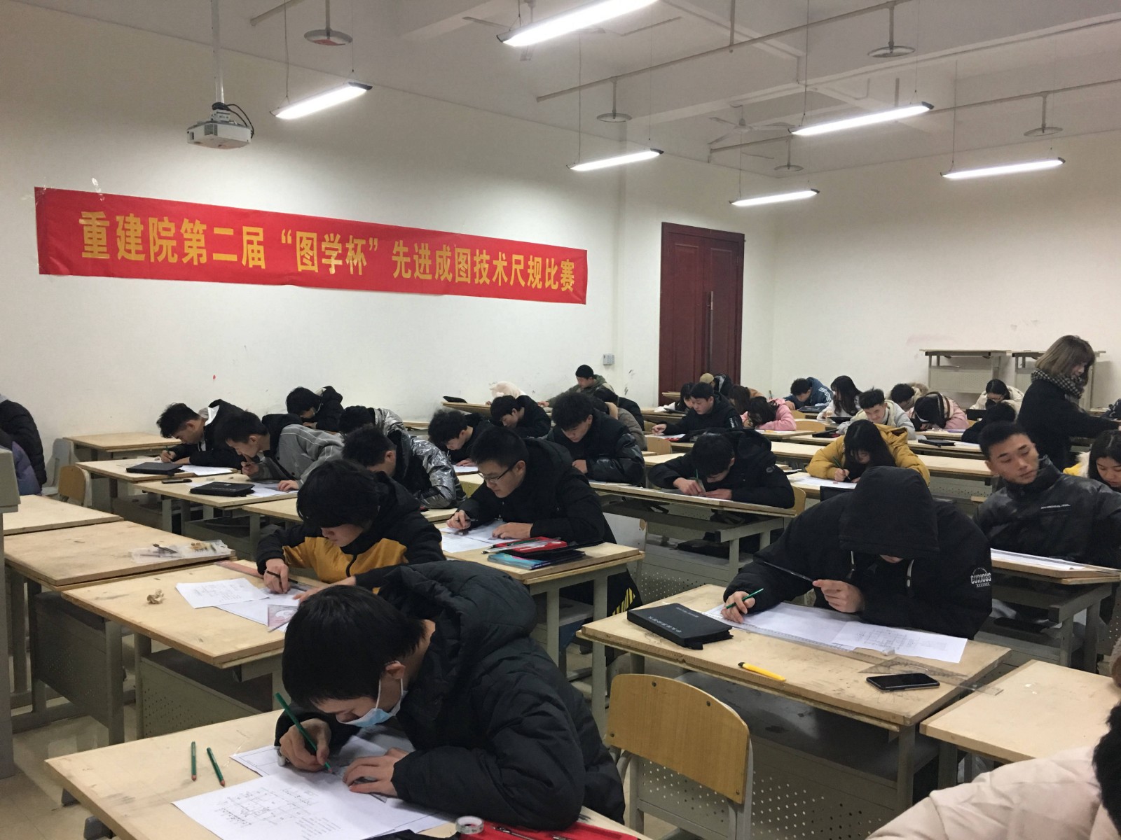 比赛过程中,同学们都十分努力,有的甚至打开了自己带的台灯,准备十分充足,让人感觉经验十足,对比赛胜券在握,在气势上就已经压了别人一头。其他的同学也不甘示弱,都在认真画图。