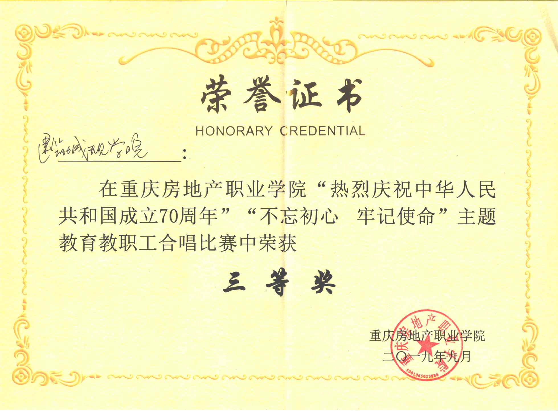 祝贺我院在重庆房地产职业学院“不忘初心,牢记使命”主题教育教职工合唱比赛中荣获佳绩