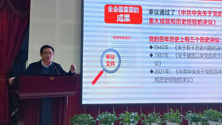 李校长围绕党的十九届六中全会基本情况、主要精神、重要决议等几个方面进行了宣讲。着重阐释了党的十九届六中全会通过的《中共中央关于党的百年奋斗重大成就和历史经验的决议》这一重要成果,深刻解读了“两个确立”、“四个伟大成就”、“五大历史意义”、“十大历史经验”、“四个必须”等内容。与此同时,李校长强调:深入学习领会党的十九届六中全会精神,要不断从党的百年奋斗历程中汲取智慧和力量,要加强党性修养、坚持自我革命、坚持独立自主,在新时代新征程上,大家齐心协力将党的十九届六中全会擘画的蓝图变为美好的实景图。