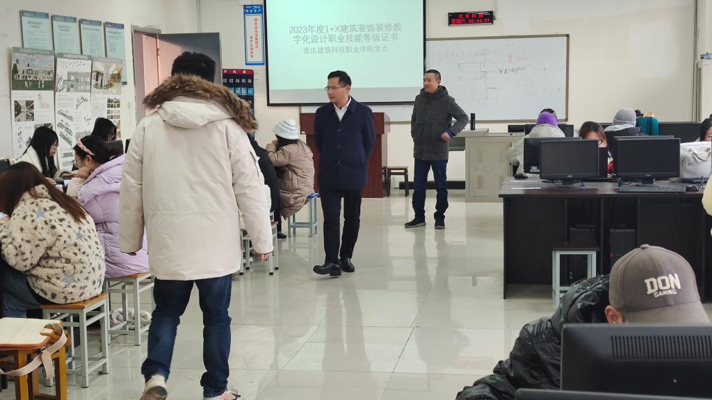 为贯彻《国家职业教育改革实施方案》精神,开展1+X证书制度试点活动,12月23日上午,我院在学校立德楼C508实训室组织开展了2023年1+X建筑装饰装修数字化设计职业技能等级考试。本次考试在学校各级领导和各个部门的大力支持下顺利开考,并圆满完成任务。学校副书记、副校长李果同志前往考试现场进行巡考。